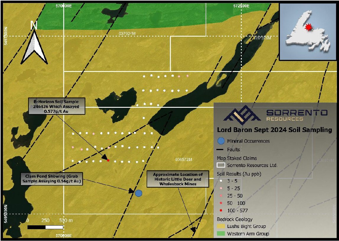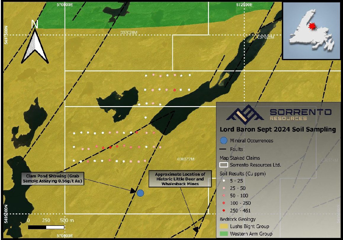 Sorrento Resources Announces Soil and Rock Sampling Results from Copper-Gold Lord Baron Project, Newfoundland